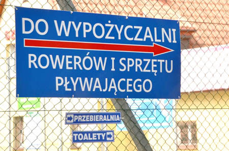 Odnośnie postulowanych przez nas przebieralni, to teraz uwaga, bo wreszcie ich doczekaliśmy! Dosłownie kilka dni temu nad wejściem-bramką do bazy wodnej pojawiła się nowa tablica z dużą czerwoną strzałką pokazującą kierunek do wypożyczalni sprzętu wodnego i rowerów. Mało brakowało, abyśmy przeoczyli to, co widać pod spodem – małe tabliczki wskazujące toalety i właśnie przebieralnię. Toalety w bazie dla plażowiczów są aż trzy, a jedno z pomieszczeń zaadaptowano na kącik zmiany strojów. Jak informuje nas MOS, tabliczki-niewidki mają być wkrótce zamienione na znacznie większe.