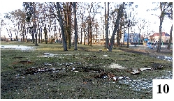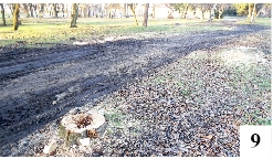 W ostatnim czasie zubożał drzewostan bezimiennego parku (kiedyś patronem był przedwojenny przemysłowiec Richard Anders) położonego w bezpośrednim sąsiedztwie szczycieńskiej Szkoły Podstawowej nr 3. Wycięto tu nieco okazów rosnących zarówno bliżej ulicy (fot. 9) , jak i tych z okolic boiska (fot. 10). Światła jest może dzięki temu więcej, poprawiło się pewnie bezpieczeństwo – ale czy jest ładniej? Na razie z pewnością nie – ścieżka prowadząca wzdłuż ulicy Marii Skłodowskiej – Curie zamieniła się w błotnistą drogę znaczoną śladami ciężkiego sprzętu, a przy szkolnym ogrodzeniu w miniony weekend leżały konkretne resztki gałęzi.