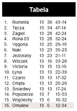 W 30. kontuzji doznał Gąsiewski, a wkrótce po zmianie stron drugą żółtą kartkę, a w konsekwencji czerwoną, zobaczył Bagiński. Tuż przed faulem piłka opuściła pole gry, lecz sędziowie akcji nie przerwali i konsekwencje były, jakie były. Inna sprawa, że na temat pierwszej żółtej kartki także można by podyskutować. Powtórzyła się w ten sposób sytuacja z nie tak dawnego meczu w Węgorzewie, gdzie Wielbarki obrońca również skompletował dwa żółte kartoniki. – W dziesięciu zagraliśmy bardzo dobrze, tworzyliśmy sytuacje – mówi trener Omulwi Marcin Wilga, mocno poirytowany decyzjami sędziów. – Remis byłby sprawiedliwy.