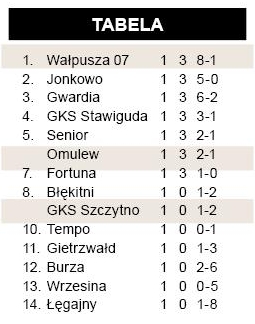 Wałpusza wrzuciła wyższy bieg jeszcze pod koniec okresu przygotowawczego, a co najmniej dobrą formę potwierdziła w inauguracyjnym meczu ligowym. Znaczny wpływ na bardzo okazałe zwycięstwo mieli zawodnicy występujący w poprzednim sezonie w innych klubach: Daniel Gołaszewski i Łukasz Gut.