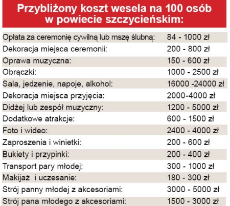 Organizatorka wesel Aneta Samsel z Dworku Marysieńka w Drężku koło Myszyńca mówi nam, że czas oczekiwania na przyjęcie weselne w tym lokalu to dwa lata, jeśli młodzi życzą sobie mieć wesele w miesiącach od kwietnia do października. W pozostałych terminach jest możliwość ustalenia wcześniejszej daty przyjęcia. Najczęściej rezerwacje narzeczeni robią po Nowym Roku, bo właśnie w święta odbywa się najwięcej zaręczyn. Wesela zwykle organizowane są tu na dwieście osób. Koszt „za talerzyk” łącznie z poprawinami wynosi od 180 do 250 zł.