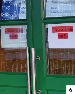 Wnętrze dworcowego gmachu to połączenie stylu minionych dziesięcioleci z nowoczesnością. Ściany niewielkiego hallu wyłożono, podobnie jak przed remontem, jasnobrązowymi kafelkami (fot. 4) . Obok niedużych papierowych rozkładów jazdy zobaczymy znacznie większe tablice świetlne podające godziny najbliższych połączeń. Jeśli skręcimy w lewo, dotrzemy do wytapetowanej (!) minipoczekalni z transparentnymi krzesełkami i tablicą manipulacyjną dla dzieci (fot. 5). Biletu w kasie co najmniej na razie nie kupimy – jest ona nieczynna. Z jakichś powodów wejście do budynku dworca przez kilka dni było jednocześnie wyjściem. Choć drzwi prowadzące do zadaszonej poczekalni znajdującej się już na zewnątrz, skąd dalej można dostać się na perony, zostały zachowane, to z ich obu stron widzieliśmy tabliczki treści widocznej na fot. 6 . Zmieniono to po tygodniu.