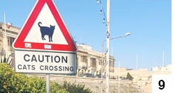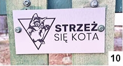 Furtki posesji prywatnych przyozdobione są niejednokrotnie tabliczkami z namalowanymi podobiznami psów i dodanymi napisami mającymi odstraszyć niepożądanych gości. „Ja tu rządzę” - to napis z gatunku delikatniejszych. „Nieproszeni goście zostaną pożarci” - to już wersja zdecydowanie ostrzejsza. Trudniej spotkać tabliczkę mówiącą o innych pupilach, które strzegą porządku lub na które po prostu warto uważać. Udało nam się ostatnio dostrzec wyjątek od reguły. Oto na ogrodzeniu pewnego domostwa zobaczyliśmy takie coś (fot. 9). Czy to kot, którym można postraszyć? A może napis dotyczy mruczka mającego jakieś tajemne moce? W dawnym Egipcie koty uchodziły z zwierzęta święte. Na bliższej nam geograficznie Malcie koty caly czas otaczane są swoistym szacunkiem. Jest ich tam bardzo dużo, a mieszkańcy i turyści dbają, by niczego im nie brakowało. Jeden z byłych mieszkańców Szczytna, pan Paweł, przysłał nam niedawno zdjęcie pokazujące, że podobizny kotów umieszczane są nawet na znakach drogowych, które ostrzegają kierowców przed przejściami dla tych czworonogów (fot. 10).