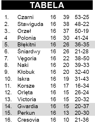 Błękitni: Olszewski, Młotkowski, (46. Król), Nosowicz, Michał Łukaszewski, Dobrzyński (87. Ciesielski), Kulesik, Niestępski, (46. Stańczak), Chrzanowski (46. Wasiak), Krupiński, Marcin Łukaszewski, P. Malanowski.
