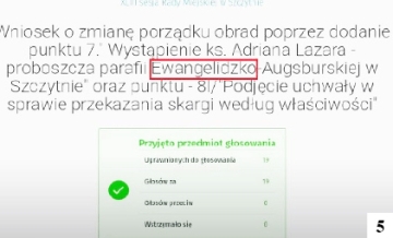 Podczas ostatniej sesji RM w Szczytnie w porządku obrad znalazł się dość nietypowy punkt. Mowa tu o wystąpieniu ewangelickiego proboszcza ks. Adriana Lazara, apelującego o pomoc w renowacji kopuły zabytkowej świątyni. Kościół przy ul. Warszawskiej, najstarszy w mieście, ucierpiał podczas lutowej wichury, a koszty naprawy są poza finansowym zasięgiem parafii. Apelowi trudno się dziwić, bo niezależnie od czyjegoś wyznania bądź jego braku na tę akurat świątynię należy także spojrzeć jak na zabytek, rozpoznawalny element naszej lokalnej kultury. Łatwiej zdziwić się można temu, co zaproponowano w elektronicznym zapisie obrad. Na filmowej relacji z sesji został utrwalony ortograficzny dziwoląg widoczny na fot. 5. Oprócz niekonsekwentnego zapisu nazwy wspólnoty (jeśli potraktujemy całość jako nazwę własną, dużą literą powinno być zapisane także słowo „parafia”) w oczy rzuca się jeszcze (a nawet bardziej) forma „Ewangelidzko”. Skąd ona się wzięła – nie wiadomo. Analogicznie używać należałoby form „protestandzki”, „katolidzki”, „po katolidzku”. Tak jednak nie piszemy, ponieważ na „dz” nie wymieniamy „k”, tylko np. „d” (Beskidy – beskidzki, Grunwald – grunwaldzki), a czasem żadnej oboczności nie ma (Grudziądz – grudziądzki). Jak więc nazwać osoby wyznania „ewangelidzkiego”?