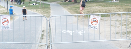 Cyklistów poruszających się naszą niemal wzorcową ścieżką rowerową prowadzącą wokół większego ze szczycieńskich jezior zaskakuje ostatnio taka dziwna informacja (fot. 7): Barierkę z kartkami tej treści umieszczono przy zjeździe w ścieżkę (zaginął gdzieś stojący tu znak) z ul. Spacerowej. Co ma teraz pomyśleć rowerzysta? Albo z jakichś niejasnych powodów należy zrezygnować z objechania jeziora, albo trzeba zsiąść z roweru i prowadzić go przez jakiś czas (w przeciwnym kierunku, za restauracją „Zacisze”, takich karteczek nie ma). Okazuje się, że zakaz obowiązuje tylko wzdłuż plaży, czyli na odcinku około 100 metrów (na wysokości mola stoi podobna przeszkoda). Dalej można już wskoczyć na siodełko i jechać. Barierka z napisem jest ustawiana przed południem, gdy na plaży robi się tłoczniej. Szkoda tylko, że nikt nie wpadł na prosty pomysł, by jakoś doprecyzować zapis związany z tym nieoczekiwanym zakazem. A czym jest on w ogóle spowodowany? Przypuszczalnie organizowaniem tu (co jakiś czas) różnych imprez oraz troską o plażowiczów, którzy leżą na kocach nie tylko na piasku przy jeziorze, ale i po drugiej stronie ścieżki pieszo-rowerowej, na trawie przed ruinami zamku.