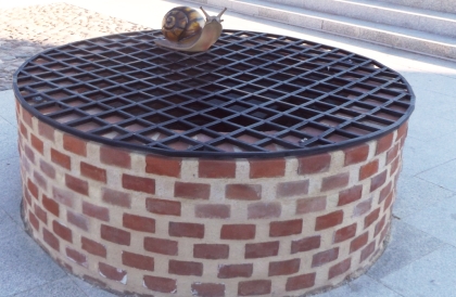W niektórych miejscach bruk jest przekładany. Na końcu jednej z uliczek dodano ostatnio kamienne schody prowadzące w stronę jeziora Kalwa (fot. 9). Na razie wygląda to trochę dziwnie, bo dalej mamy udeptaną ziemię, ale byłoby jeszcze dziwniej, gdyby za jakiś czas całości nie domknięto.Przeszłość przeszłością, jednak w zabytkowej części Pasymia pojawiają się i elementy kojarzące się z naszymi czasami. Po lewej stronie wejścia do magistratu działa już chodnikowa fontanna (fot 10.). O tym, że Pasym należy do sieci Cittaslow, przypominają aż dwa ślimaki. Pierwszy z nich pełznie z godnością typową dla niespieszących się tuż przy ratuszowych drzwiach, drugi ulokował się na kracie nad studnią i wygląda jak żywy (fot. 11).