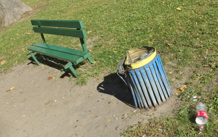 W związku ze zbliżającymi się Zaduszkami niedawno odwiedziliśmy cmentarz komunalny i dawny katolicki przy ul. Kętrzyńskiego. Teraz zaglądnęliśmy na nieczynną już nekropolię ewangelicką, z kwaterą żołnierską z czasów I wojny światowej. Obecnie teren pełni rolę parku. Jak zauważyliśmy, siatka okalająca cmentarz od strony ul. Piłsudskiego wymagałaby naprawy, a najlepiej wymiany. Wewnątrz ustawiono odnowione, zielone ławeczki, a każdej towarzyszy kosz na odpadki. Nie każda jednak jest w dobrym stanie technicznym, bo niektórym brakuje np. części siedziska. Widać to na kolejnym zdjęciu przedstawiającym robotę wandali, którzy wyłamali jedną z desek. Nie oszczędzili też kosza, obok którego wala się plastikowa butelka.