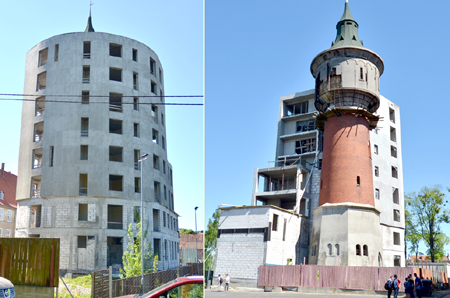 Jeszcze jedno na koniec. Wspomniane budyneczki zdobiące posesję spółki Aqua”zostały oddane do użytku w tym samym czasie co wieża ciśnień, czyli w 1908 r. Wraz z nią tworzyły bowiem miejski kompleks wodociągowy. Zapytajmy zatem, jak dziś wygląda wieża? Idąc np. na plażę ul. Spacerową, można odnieść wrażenie, że zupełnie znikła z krajobrazu miasta. Ona jednak jest, tyle że mocno już zrujnowana, z potężną dziurą na wysokości zbiornika wody i opleciona dziwną, niedokończoną budowlą. Ów okrąglak otaczający wieżę miał wzbogacić nasze miasto o luksusowe apartamenty mieszkalne i kawiarnię na dachu z fantastycznym widokiem na panoramę miasta. Co z tych wspaniałych zamierzeń wynikło - każdy widzi.
