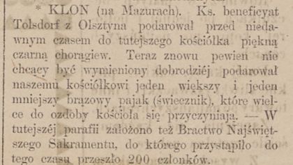 Kolejnym proboszczem był ks. August Stock, który 8 września 1886 r. przeniesiony został do Purdy, a na jego miejsce przyszedł ks. Wiktor Warkowski z Lesin Wielkich. Od listopada 1891 r. do 1898 r. proboszczem w Klonie był Jan Kossendey, a po nim do 1898 r. Andrzej Bajeński. W 1903 r. proboszczem został ks. Karol Jabłonka. To za jego czasów w 1910 roku zbudowano wieżę kościelną, na której zamontowano 3 wiszące wcześniej w drewnianej, wybudowanej w 1869 r. dzwonnicy, dzwony. W trakcie I wojny zostały one zarekwirowane. Nowe zawieszono około 1920 r. W 1920 r. Jabłonka przeniesiony zostaje do Wielbarka i obowiązki duszpasterskie w Klonie wykonywał Paweł Grunberg. W 1925 r. do liczącej 810 wiernych parafii należało 27 miejscowości. W 1925 r. we wsi po polsku mówiło jeszcze 72% mieszkańców. Od 1926 r. proboszczem w Klonie był Karol Langeald. W późniejszym okresie proboszczem obowiązki te pełnił Pater Georg Heide.