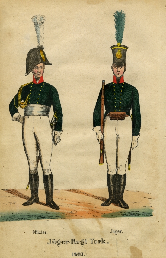 W 1808 roku utworzony został Ostpreußische Feldjäger-Bataillon, jednak początkowo stacjonował on w Mittenwalde, a później w latach 1810-1815 we Frankfurcie nad Odrą. W 1809 roku strzelcy trafili pod dowództwo swojego późniejszego patrona, generała majora Yorcka. W 1812 roku wraz z armią pruską wzięli udział w wojnie z Rosją jako sojusznicy napoleońskiej Francji. W tym samym roku na konferencji w Taurogach generał Dybicz skłonił generała Yorka do porzucenia Francuzów i przejścia na stronę rosyjską. Yorck zrobił to wbrew woli króla pruskiego, który się wahał i obawiał zwycięstwa Napoleona. Był to początek wojny 1813-1815, w trakcie której walczyli wschodniopruscy strzelcy.