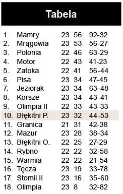 Warmianka Bęsia – Mini Soccer Academy Mrągowo 4:0, Salęt Boże – KS Łęgajny 3:1, Błękitni Stary Olsztyn – CWKS 2020 Lamkowo, Pogoń Ryn – Szansa Reszel – mecze odwołane. Pauzowały Juksty Muntowo.{/akeebasubs}
