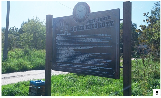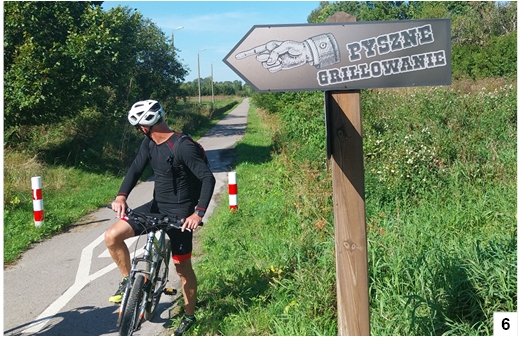 Jakoś nie przybywa infrastruktury towarzyszącej. Gdy przejeżdżamy np. wzdłuż dawnej stacyjki w Olszewkach (fot. 4), nie znajdziemy żadnej tabliczki dotyczącej historii tego miejsca. Domyślamy się, że coś tu było, widząc pozostawioną krawędź peronu, nieczynne lampy czy ceglany budynek już bez napisu z nazwą. Parę lat temu ktoś zorganizował akcję sadzenia drzewek wzdłuż ścieżki blisko stacyjki w Ochódnie. Przy ustawionych palikach rosną generalnie tylko jakieś badyle, przy niektórych nie rośnie nic. A mogło być przecież ładnie – ale trzeba by przy tym trochę pochodzić, a nie liczyć na to, że drzewka same dadzą sobie radę. Zarastają chwastami obrzeża odnowionych parę lat wstecz mostków. Niestety, można odnieść wrażenie, że opieka nad ścieżką polega na sporadycznym koszeniu pobocza – ale nie na całej długości trasy. Dodanym elementem jest spora tablica ustawiona przy stacji w Nowych Kiejkutach (fot. 5) i kierunkowskaz zachęcający do odwiedzenia pobliskiego miejsca przeznaczonego do grillowania (fot. 6). Trochę mało jak na liczący około 30 kilometrów odcinek leżący w granicach naszego powiatu.