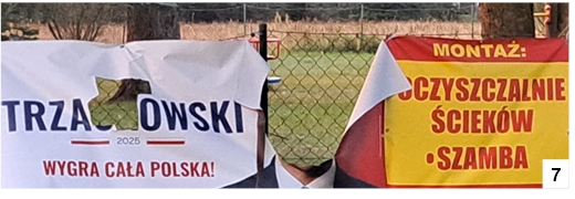 O powyborczych od pewnego czasu banerach wiszących jeszcze tu i ówdzie pisaliśmy już kilkakrotnie i wydawało się nam, że temat jest całkowicie zamknięty. Było to, bijemy się w piersi, błędne przekonanie. W Wawrochach widzieliśmy w minionym tygodniu nieco już zniszczony plakat przedstawiający jednego z kandydatów startujących w drugiej rundzie wyborów prezydenckich. Czy uszkodzenia wynikają z warunków pogodowych, czy złośliwości przeciwników politycznych – tego nie wiemy. Dla dobra owego kandydata plakat powinien już zniknąć. Nas zaintrygowało dodatkowo sąsiedztwo reklamowe, w którym ów materiał wyborczy się znalazł (fot. 7). ..