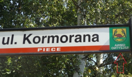 Już od paru lat sprawę ułatwiają tabliczki z nazwami odwołującymi się do mazurskiej fauny i flory. Mamy więc w Piecach ulice: Sarnią, Węgorzową, Leszczową, Lipową czy Wrzosową. Naszą uwagę zwróciły dwie tabliczki. Na końcu osady tabliczka na słupku kieruje nas w stronę ul. Borsuczej (fot. 6), ale wjechać w nią raczej trudno. Oryginalny z innych powodów jest wjazd w ul. Kormorana. Wszystkie tabliczki mają dodany herb gminy Szczytno, ale w tym jednym miejscu podpis pod nim jest z nieznanych powodów odwrócony (fot. 7). Ot, taki biały kormoran, przepraszamy, biały kruk.