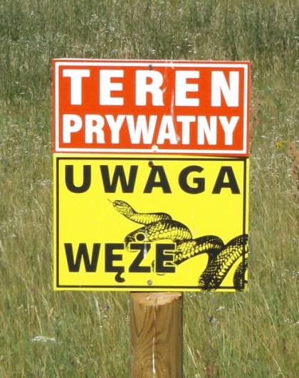 Tylko jedna z ulic odbiega swoją nazwą od charakteru pozostałych – to główna ulica miejscowości, nazwana odpowiednio Centralną. Przy wjeździe od strony DK 53 witają nas z lewej strony rzadko spotykane w naszych stronach ostrzeżenia (fot. 8.). Może więc warto wpisać się w klimat pozostałych uliczek i przechrzcić tę częściowo wyasfaltowaną ulicę na Wężową?