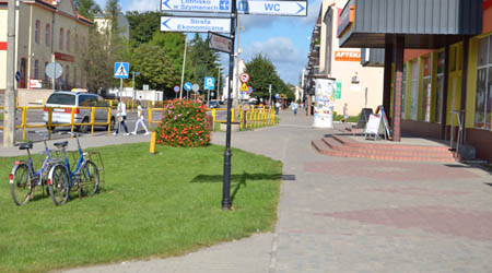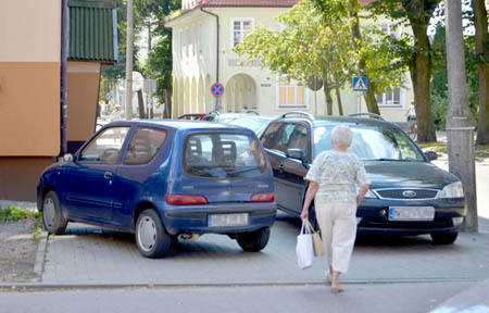 W dziwnych miejscach parkowane są nie tylko rowery, ale także samochody. Na szczęście do rzadkości należy parkowanie aut na trawnikach, ale za to wielu kierowców zostawia swoje maszyny na chodnikach. Jeśli zgodnie z przepisami – w porządku, ale jak reagować, gdy zobaczymy coś takiego, co miało miejsce w ubiegły czwartek na ul. 3 Maja? Zaraz za apteką samochody stały na całej szerokości trotuaru, więc doszło tutaj do kuriozalnej zamiany ról – chodniki dla samochodów, ulice dla pieszych(!). I jak tu przechodnia nie ma trafić szlag? Co ciekawe, przecznicę dalej, miasto urządziło wielki parking samochodowy (dla autobusów i aut osobowych). Sprawdźmy czy tam też jest tłok. I co? Na wielkim parkingu widać tylko pojedyncze pojazdy stojące na jego obrzeżach, poza tym kompletna pustka.