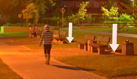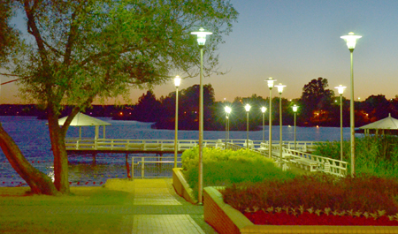 Gdy nie tylko dni są ciepłe, ale i wieczory, warto pospacerować ulicami miasta, a najlepiej plażą właśnie po zachodzie słońca. Ciekawie oświetlone nadjeziorne okolice, molo czy pasaż Klenczona wyglądają wówczas bardzo urokliwie i wręcz bajkowo. Swoją małą iluminację miały też nadjeziorne ławki, ale z nieznanych powodów od ubiegłego roku przestała ona działać. Dawniej te „nocne” lampki (zainstalowane w miejscach oznaczonych na fotografii strzałkami) delikatnie rozświetlały mrok, przydając romantycznej atmosfery, co szczególnie ceniły sobie zakochane pary. Teraz, niestety, nie świecą, a gdyby ktoś sądził, że to miasto wyłączyło prąd z powodu oszczędności byłby w błędzie, bo np. w ratuszowej wieży światło pali się całymi nocami.