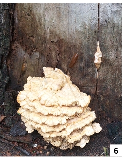Grzyby to organizmy wszędobylskie i spotkamy je nie tylko w lasach. Poza obszarami leśnymi chętnie rosną np. purchawice olbrzymie, czyli czasznice. Parę sezonów wstecz pisaliśmy o całej grupie tych niemałych grzybów, które wyrosły w przydomowym ogrodzie u jednego z naszych czytelników. W miniony weekend podczas przejażdżki widzieliśmy tuż za Szczytnem gromadę zrośniętych ze sobą czasznic (fot. 5) . To bardzo smaczne grzyby, których pomylić z czymś innym raczej się nie da. Można je przyrządzać jak kanie, czyli panierować. Ale ile osób musiałoby się zebrać, by zjeść kotlety z tylu okazów? Oryginalnie wyglądają także nadrzewne żółciaki siarkowe (fot. 6). Jak twierdzą znawcy tematu, smakiem przypominają kurczaka. My jakoś akurat na te grzyby jeszcze się skusiliśmy, ale jeśli ktoś nas kiedyś poczęstuje, to kto wie...