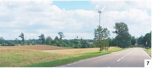 Od paru miesięcy emocje w gminie Wielbark wzbudza kwestia postawienia turbin wiatrowych. Argumenty są, rzecz jasna, zarówno za jak i przeciw ewentualnej inwestycji. Nieliczni przedstawiciele gminy udali się niedawno do Pelplina w województwie pomorskim, by obejrzeć tamtejszą farmę wiatrową. Wiatraki przypominające te współczesne zaczęto w Polsce stawiać na początku lat 90. ubiegłego wieku, a pierwszą lokalizacją był kojarzący się energetycznie Żarnowiec na Pomorzu. Inwestorzy nieustannie interesują się zresztą północnymi rejonami Polski. Tam panują korzystniejsze warunki wietrzne. Kilka farm od lat istnieje także w naszym województwie. Spore skupiska wiatraków zobaczymy w okolicach Kisielic niedaleko Iławy, Gołdapi oraz bliżej nas – w rejonie Działdowa czy Korsz. W minione wakacje widzieliśmy z całkiem bliska ostatnią z tych farm. Gdy jechaliśmy drogą Bartoszyce-Kętrzyn, przez sporą część trasy towarzyszył nam dość nietypowy widok. Wiatraki wyglądały jak wielkie drzewa rosnące blisko drogi (fot. 7), a niekiedy można było odnieść wrażenie, że postawiono je blisko zabudowań, a nie ileś setek metrów od nich, czyli zgodnie z przepisami (fot. 8) . W gminie Korsze udało się przeforsować postawienie 35 wiatraków (po 2 MW każdy), a farma działa od parunastu lat. Gmina, która za turystycznego prymusa raczej nie uchodzi, ma stały dopływ gotówki, ale z radością ze strony mieszkańców bywa prawdopodobnie różnie. Wiatraki jednych swoim wyglądem mogą fascynować, dla innych to niszczenie krajobrazu. Urządzenia te, pracując, powodują niekiedy dyskomfort – nie są chociażby bezgłośne. Listę plusów i minusów chyba każdy z grubsza zna.