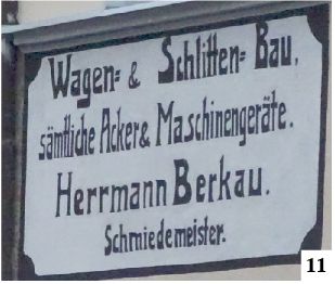 Od pewnego czasu odnawiany jest ciąg ciekawych architektonicznie budynków znajdujących się przy głównej ulicy tego miasteczka nad Omulwią. Stwarza do okazję do dotarcia do niewidocznych od lat reliktów przeszłości. Gdy przejeżdżamy ulicą Jagiełły (fot. 10) , nie możemy nie zwrócić uwagi na świeżo odnowiony (i długi) napis na jednej z kamienic – dawny szyld informujący, że swoich klientów przyjmował tu mistrz kowalski (fot. 11).