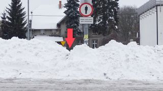 O niedozwolonym przechodzeniu przez plac manewrowy znajdujący się przy szczycieńskim „Kauflandzie” już swego czasu pisaliśmy. Nie pomagają stojące w kilku miejscach znaki zakazu czy przeprowadzane akcje policji. Niektórzy muszą iść koniecznie na skróty (to raptem parędziesiąt metrów mniej) – i koniec. Teoretycznie wytłumaczalne jest to w niedziele, gdy duże samochody dostawcze nie zajeżdżają pod market. Od poniedziałku do soboty takie przechodzenie przez plac jest zwyczajnie niebezpieczne. Obfite opady białego puchu sprawiły, że śnieg zepchnięty z parkingu przy markecie utworzył tu wysoką bandę (fot. 5). Ciągnie się ona przez całą długość placu manewrowego. Mogłoby się wydawać, że co najmniej do odwilży nielegalny skrót zostanie zablokowany. Gdzieżby tam! Na własne oczy widzieliśmy, jak nie najmłodsze już osoby przedzierały się czymś w rodzaju utworzonego w zaspie wąwozu (zaznaczyliśmy go strzałką). Wystarczy wspiąć się coś koło metra – i droga wolna.