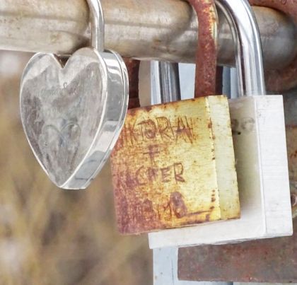 Na zakochanych czeka wciąż w Szczytnie kładka nad kanałem łączącym oba jeziora (fot. 8). Kłódek symbolizujących piękne uczucie nieustannie tam przybywa. Niektóre zdążyły już zardzewieć, co trochę kłóci się z powiedzeniem dotyczącym miłości. Obok kłódek standardowych, czyli takich, które służą np. do zabezpieczania wejść do piwnicy, znajdziemy specjalne, czerwone, lub mające kształt serca (fot. 9). Nie wszyscy młodzi dobrze pamiętają, że przed budową ścieżki pieszo-rowerowej mostek był bardziej klimatyczno-romantyczny, ze schodkami i daszkiem (fot. 10). Z drugiej strony dość grube elementy drewniane konstrukcji uniemożliwiały w zasadzie zawieszanie kłódek z inicjałami czy imionami zakochanych i konieczne było wydłubywanie napisów na poręczach lub w dolnej części zadaszenia.